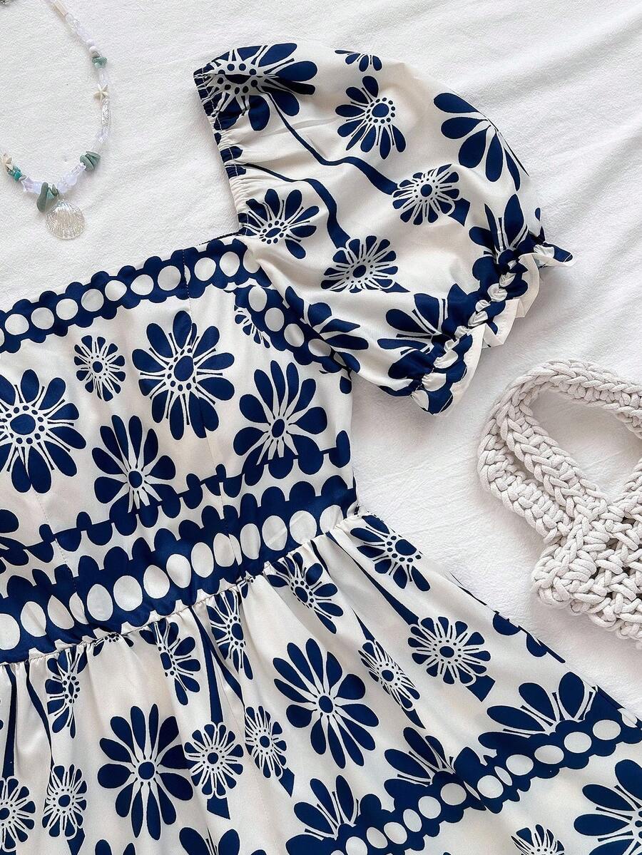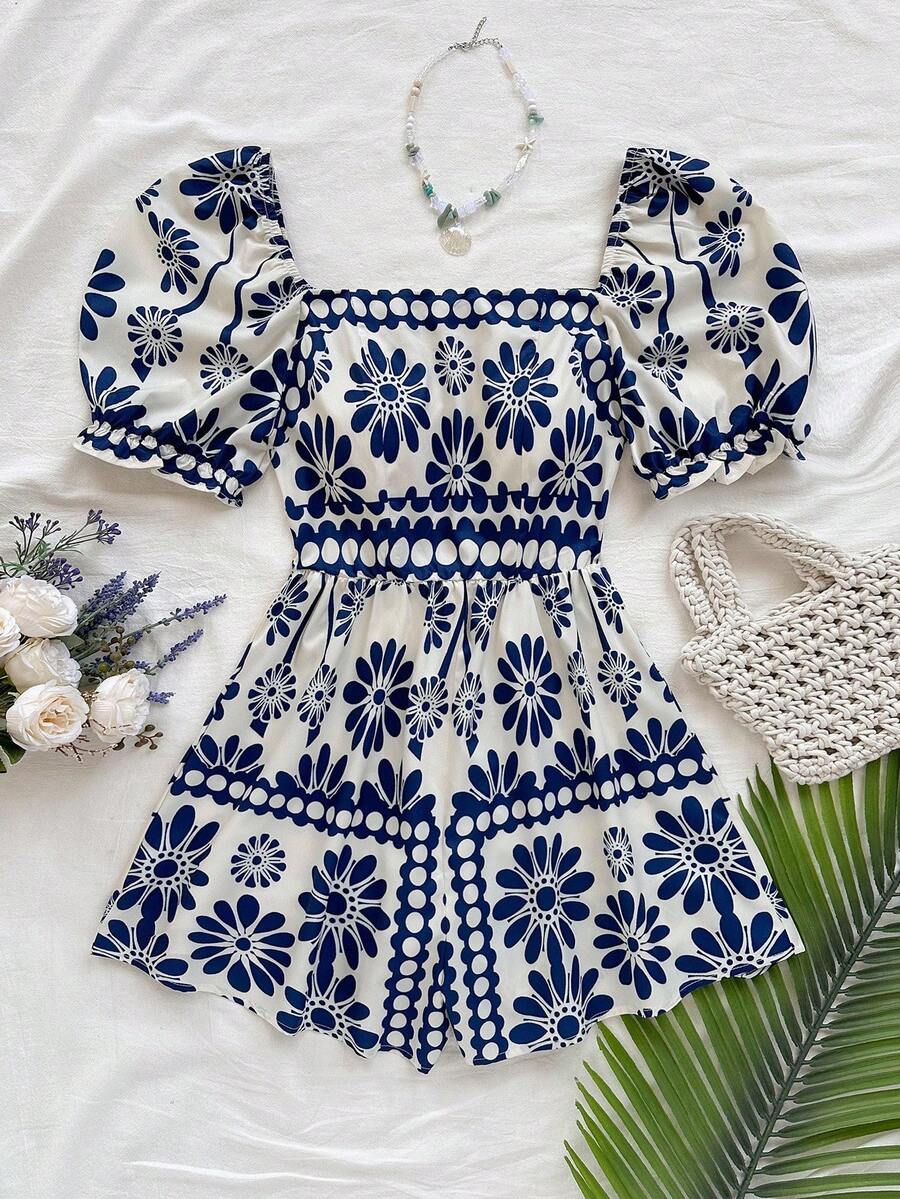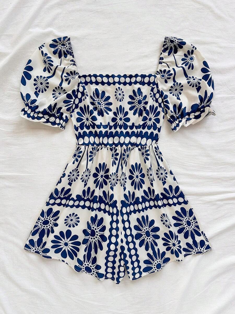 The square neckline beautifully highlights your collarbone, while the puff sleeves add a romantic retro touch. The cinched waist defines your shape, and the flowy wide-leg design gives you that relaxed, vacation-ready vibe.