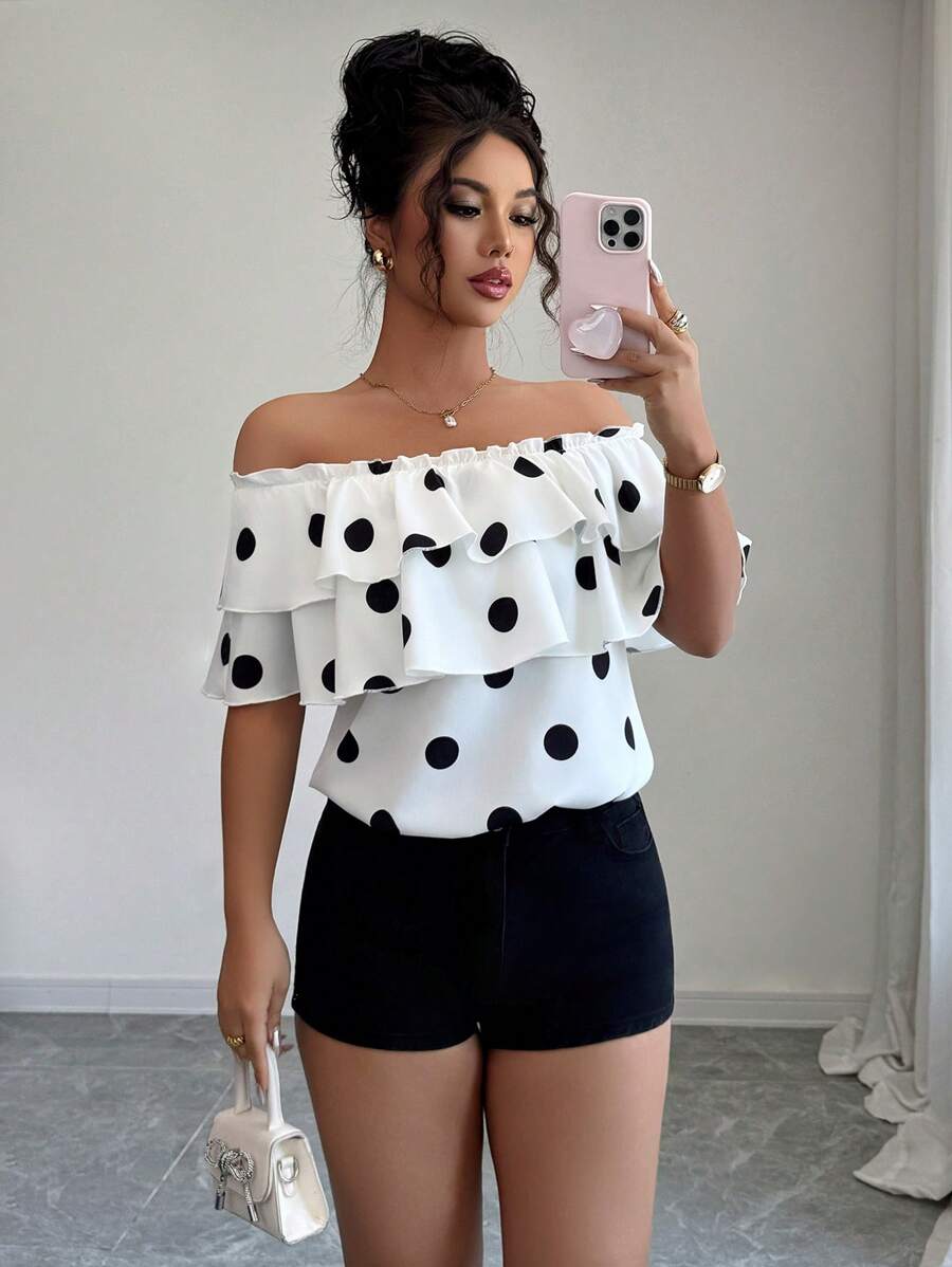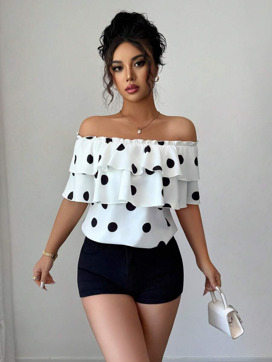 Elevate your summer wardrobe with this Polka Dot Off-Shoulder Ruffle Blouse! Designed for women who love a blend of casual elegance and playful charm, this top features a tiered ruffle design that adds volume and movement, making every outfit feel feminine and stylish.
